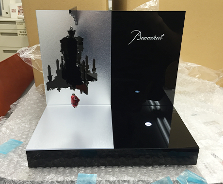 製作事例case 写真をクリックすると拡大表示されます。 百貨店向けディスプレイ 高級グラス展示台 W250 × D200 × H300 【仕様】 アクリル・カッティングシート・シルク印刷 【内容】 シャンデリアをイメージしてアクリルレーザー加工で細かくカットした部品を組み合わせて吊り下げています。シルバー部分はアクリルミラーにタペシートを貼ってマット調に仕上げています。 事例トップへ