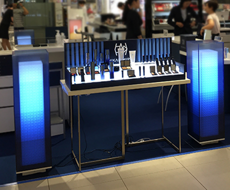 製作事例case 写真をクリックすると拡大表示されます。 百貨店向け 化粧品ディスプレイ プロモーションテスター什器 【仕様】 アクリル・木工・スチール・LED・インクジェット 【内容】 違う素材を組み合わせた複合什器です。それぞれの長所を活かし、高級感が出るようになっています。 事例トップへ